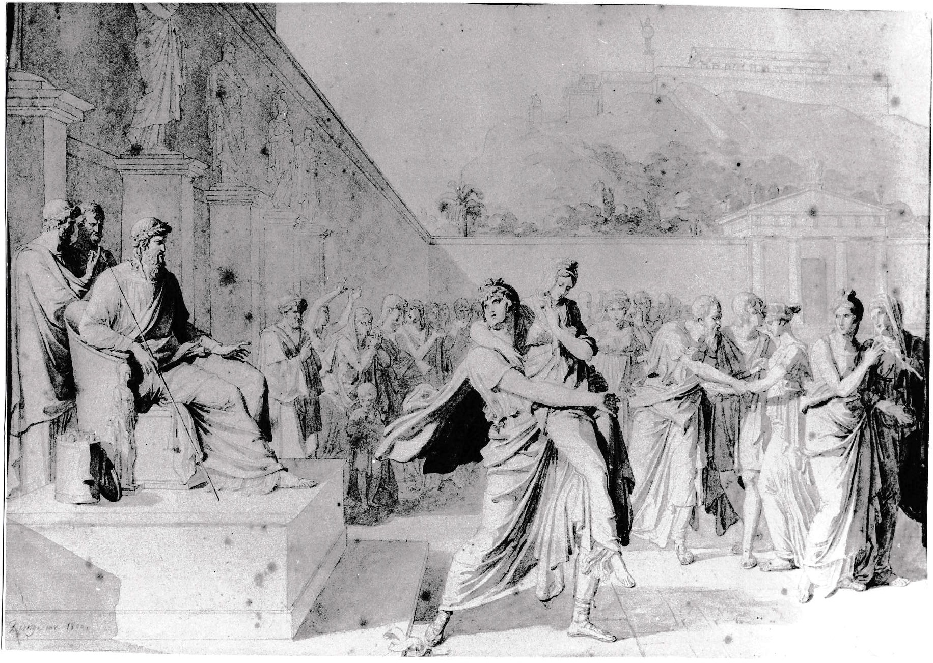 Notre Œuvre monumentale aux figures théâtrales: Alcibiade et Hipparète huile sur toile a figuré au salon de 1801 d'après le dessin préparatoire lavis de bistre sur papier blanc crème signé et daté A.DEVOSGE 1800 et conservé au musée de Dijon