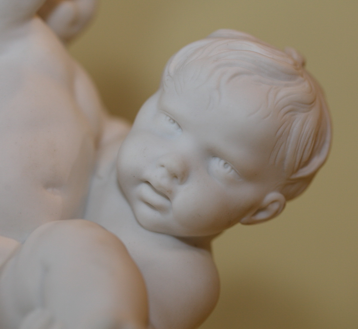SEVRES 1893 paire de groupes en biscuit, soclés porcelaine bleue "Putti jouants"