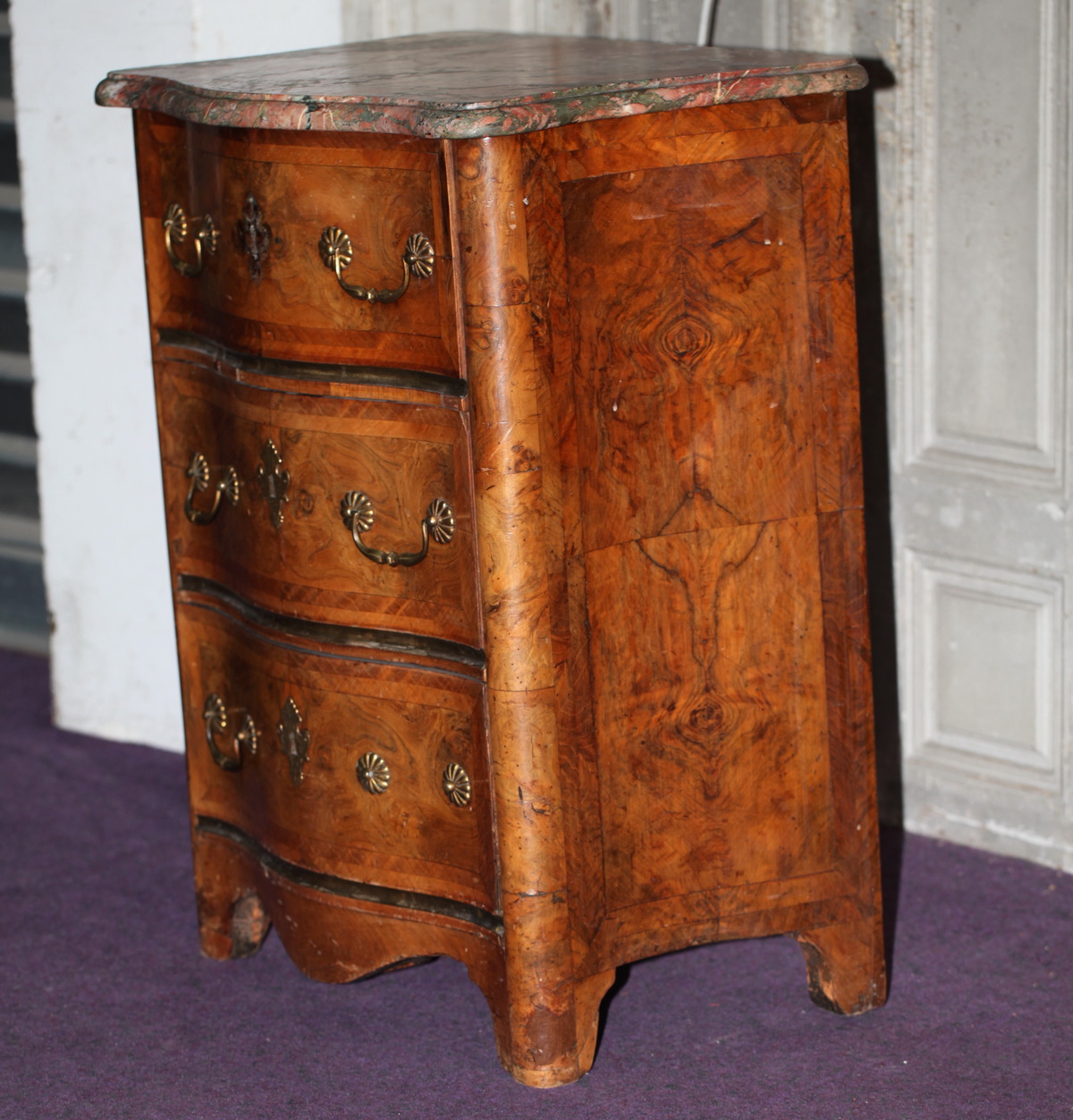 Petite commode en placage de ronce de noyer ouvrant par 3 tiroirs en façade, dessus marbre rose veiné Dauphiné époque XVIII