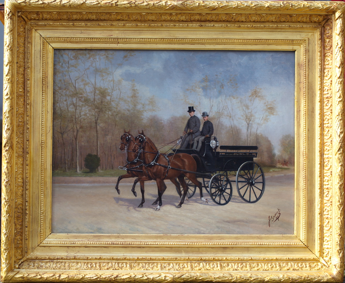 John GRANT Ecole Anglaise du XIX ème "Voiture à cheval dans Hyde Park" huile sur toile signée datée 1887 en bas à droite, cadre stuc doré.