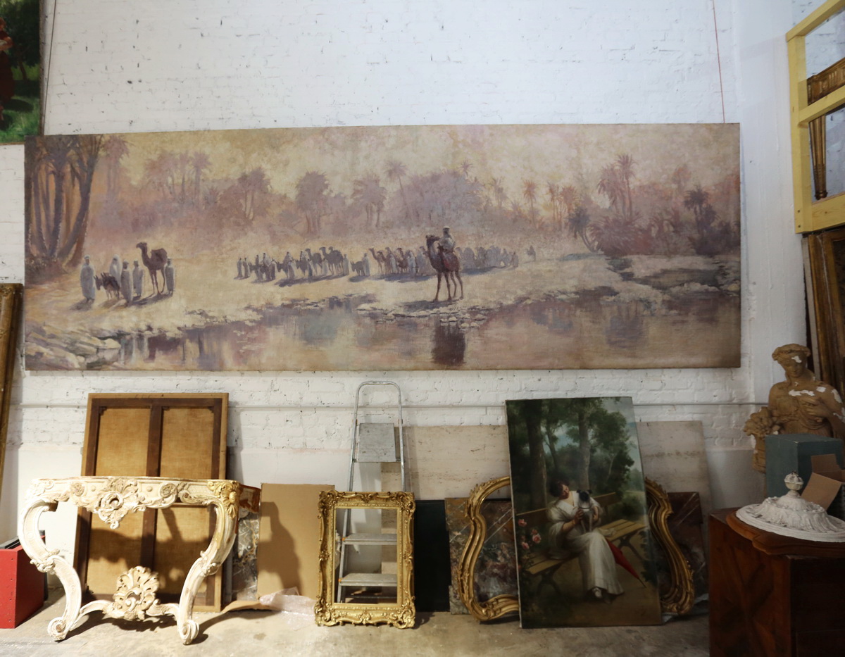 Très importante peinture panoramique, la caravane dans l'oasis, école orientaliste, huile sur toile début du XXème
