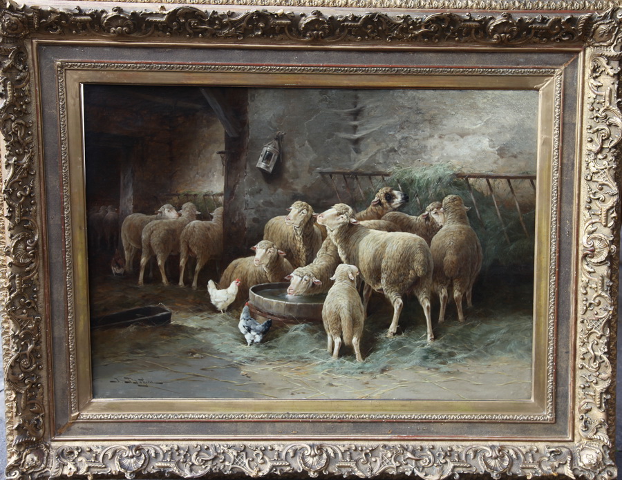 Jules G.Bahieu 1860-1895 "Moutons et poules dans la bergerie" H/T sbg dans son cadre en stuc doré