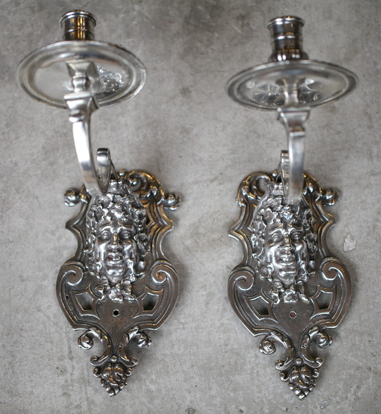 Paire d'appliques d'époque Régence en bronze réargenté, ciselé à décor de masque d'homme barbu