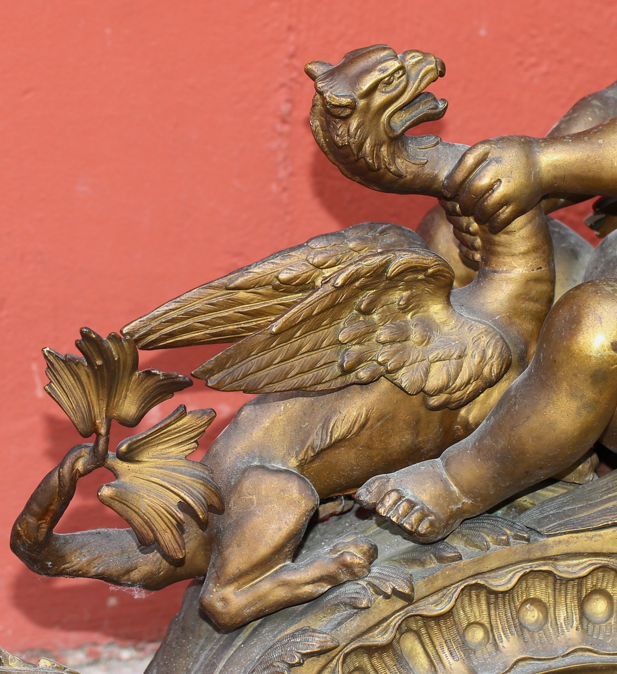 Paire de feux de cheminée en bronze doré. Socle mouvementé surmonté de rochers de style rocaille à cannelures, feuilles et rinceaux. Sur chacun est assis un enfant ailé luttant avec une chimère. Epoque Louis-Philippe. Haut. : 42 cm - Larg. : 67 cm Un feu de même modèle livré par Chaumont en 1838 pour Louis-Philippe se trouve toujours dans le salon de famille du Grand Trianon