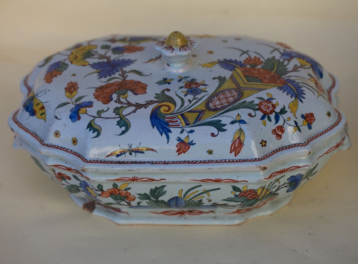 Paire de légumiers en faïence de Rouen décor corne d'abondance un d'époque XVIII ème (égrenure)