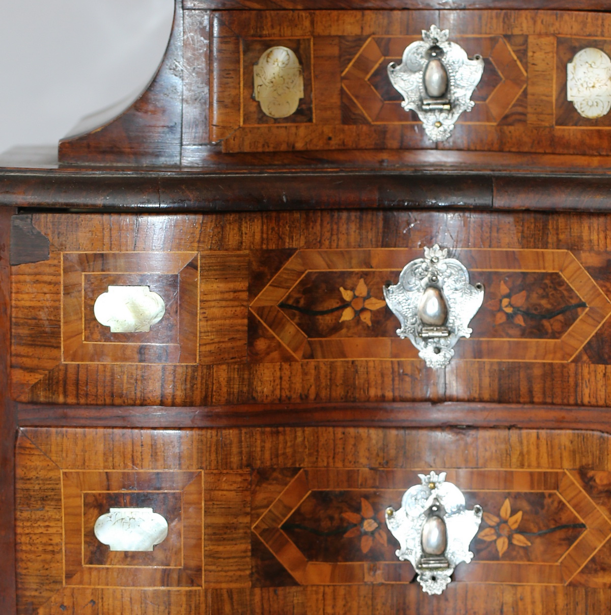 Cabinet meuble de maîtrise Hollande XVIII ème en bois de placage, entrées de serrures en argent, 4tiroirs en façade