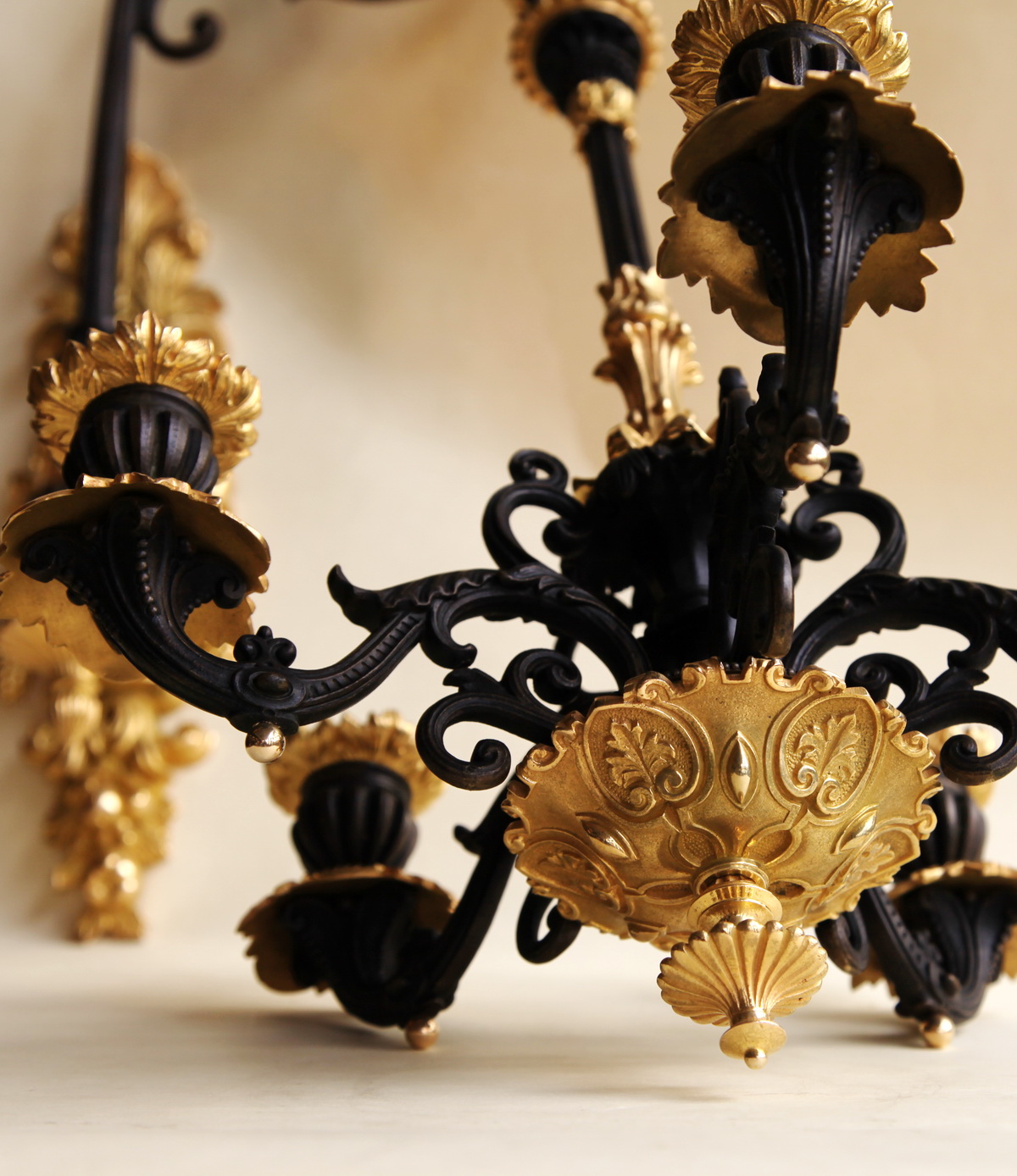 Rare suite de 6 appliques à 6 bras de lumière en bronze redoré et patiné provenant d'un chateau en bretagne vers 1840