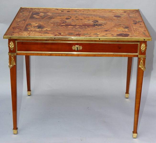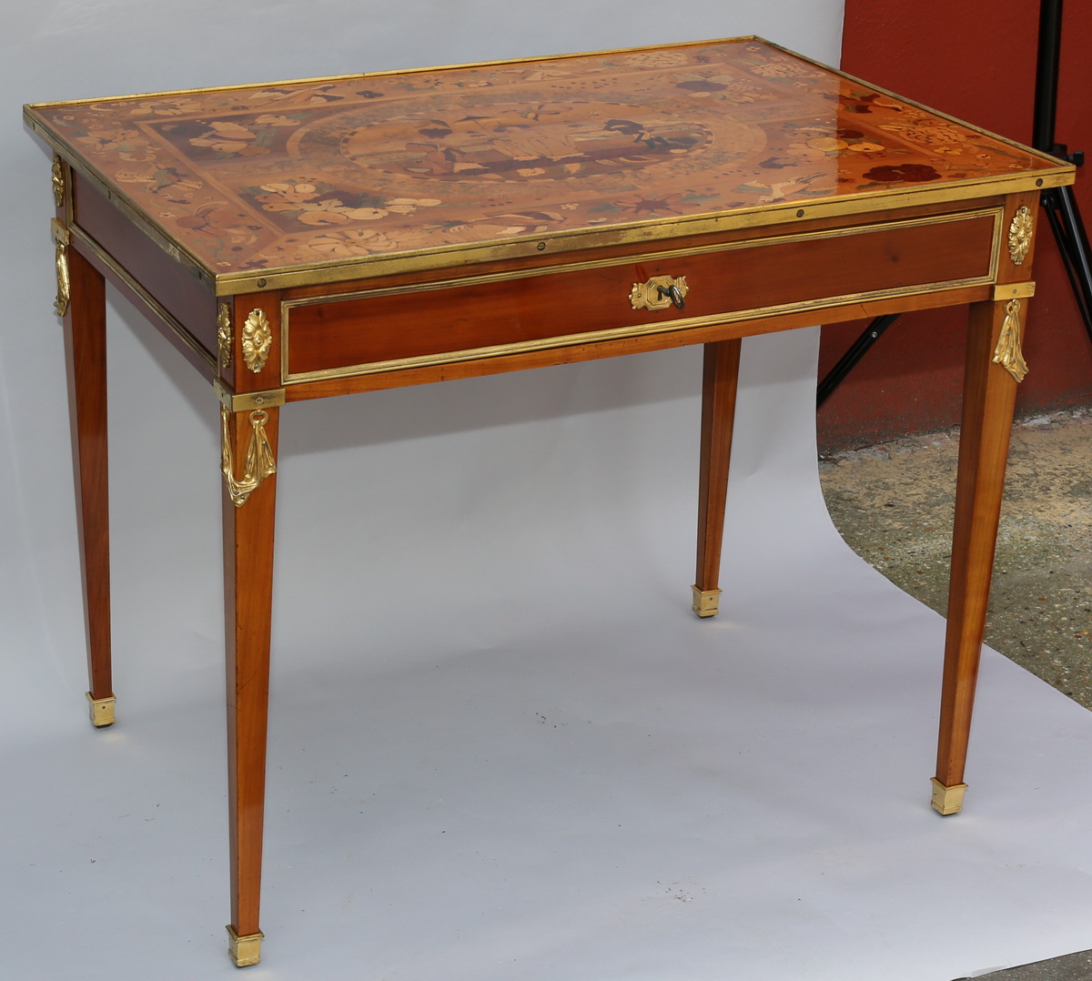 Table bureau de style Louis XVI en bois fruitier, plateau en marqueterie, un tiroir en ceinture époque fin XIX ème.