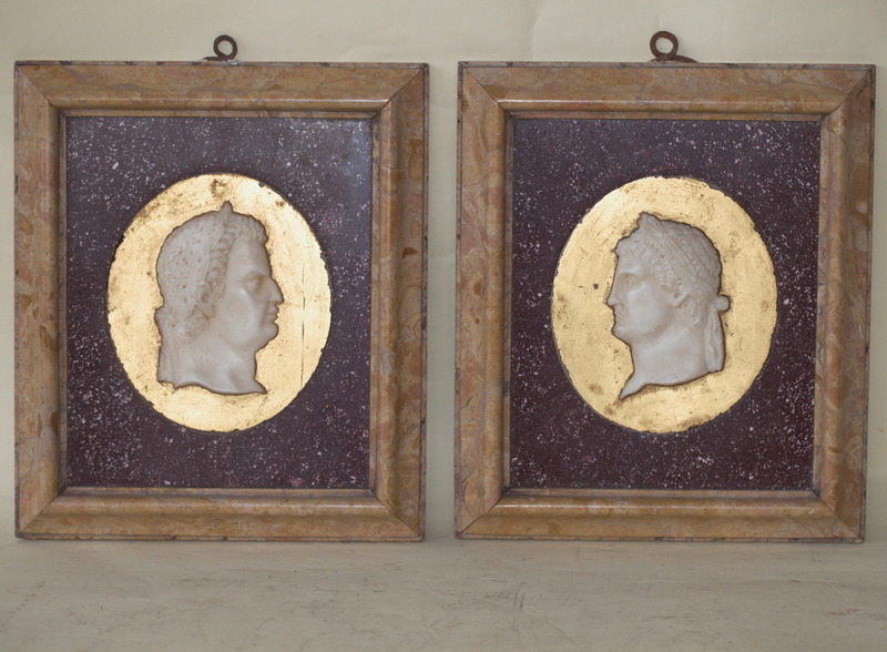 Pair of profiles of Roman emperors amid porphyry and marble frame, Italy late nineteenth