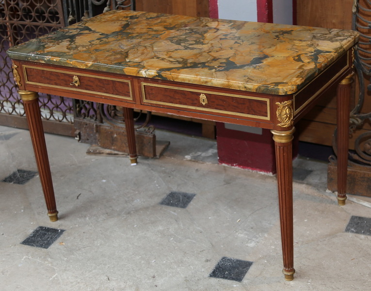 flat desk in mahogany and mahogany veneer moiré opening with 2 drawers belt, gray and yellow marble top breccia, Louis XVI style circa 1880