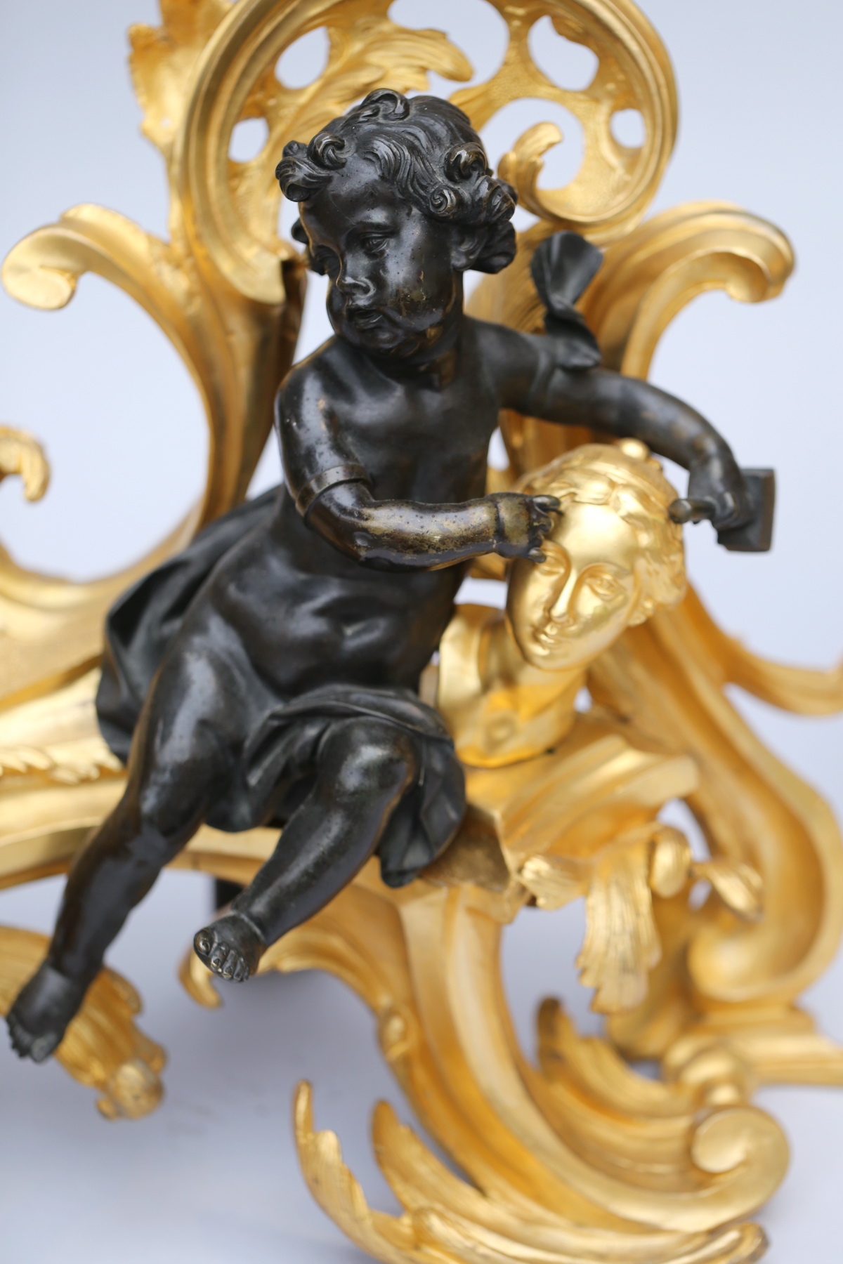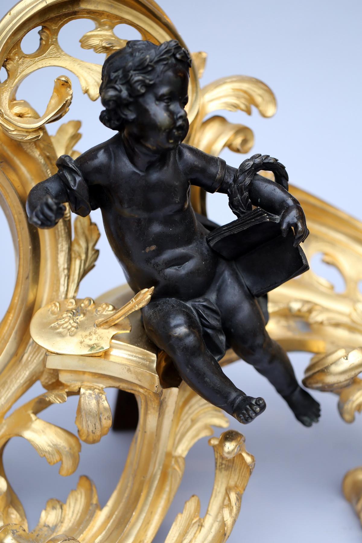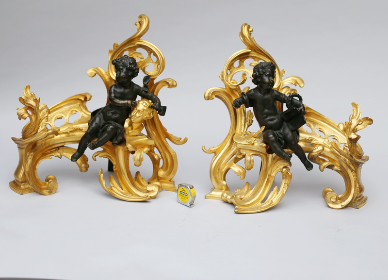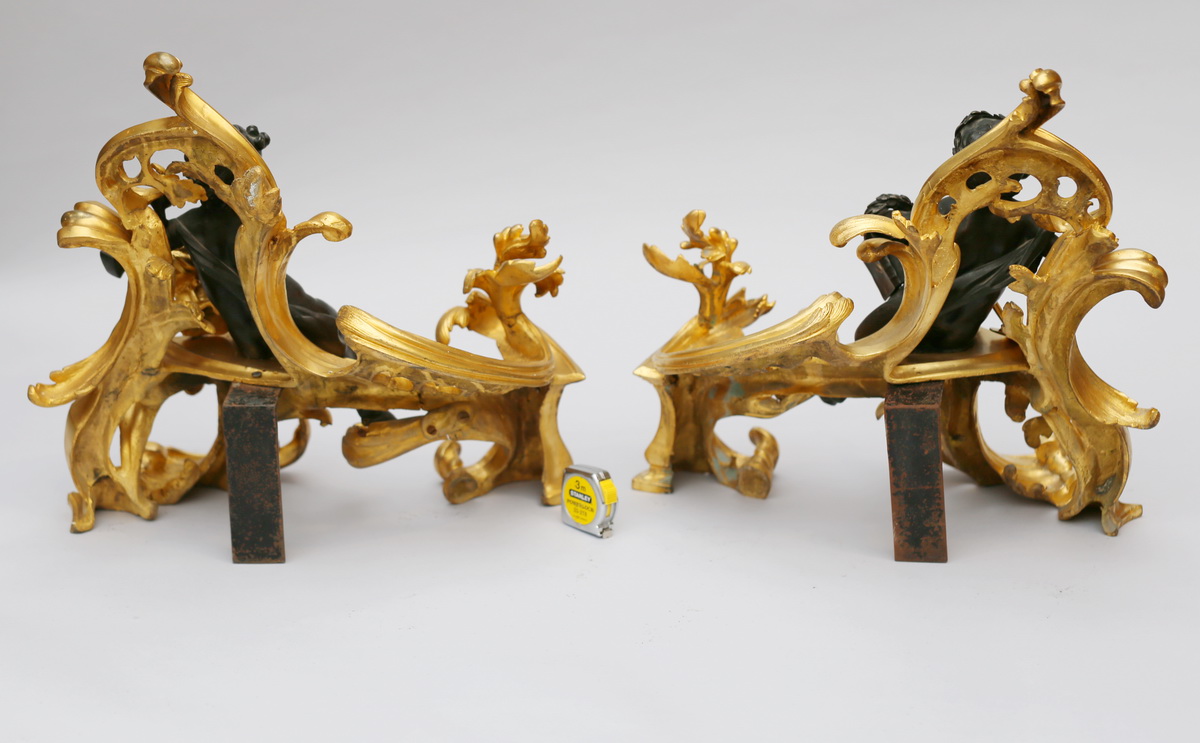 Pair of andirons of Louis XV style sculpture and painting late 19th century