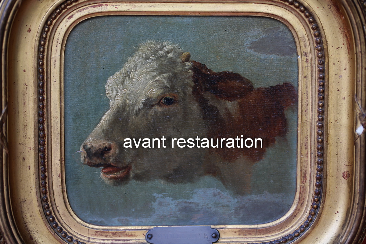Balthasar Paul OMMEGANCK 1755-1826 "Study on the head of a calf" oil on canvas mounted on cardboard wooden frame and gilded stucco nineteenth