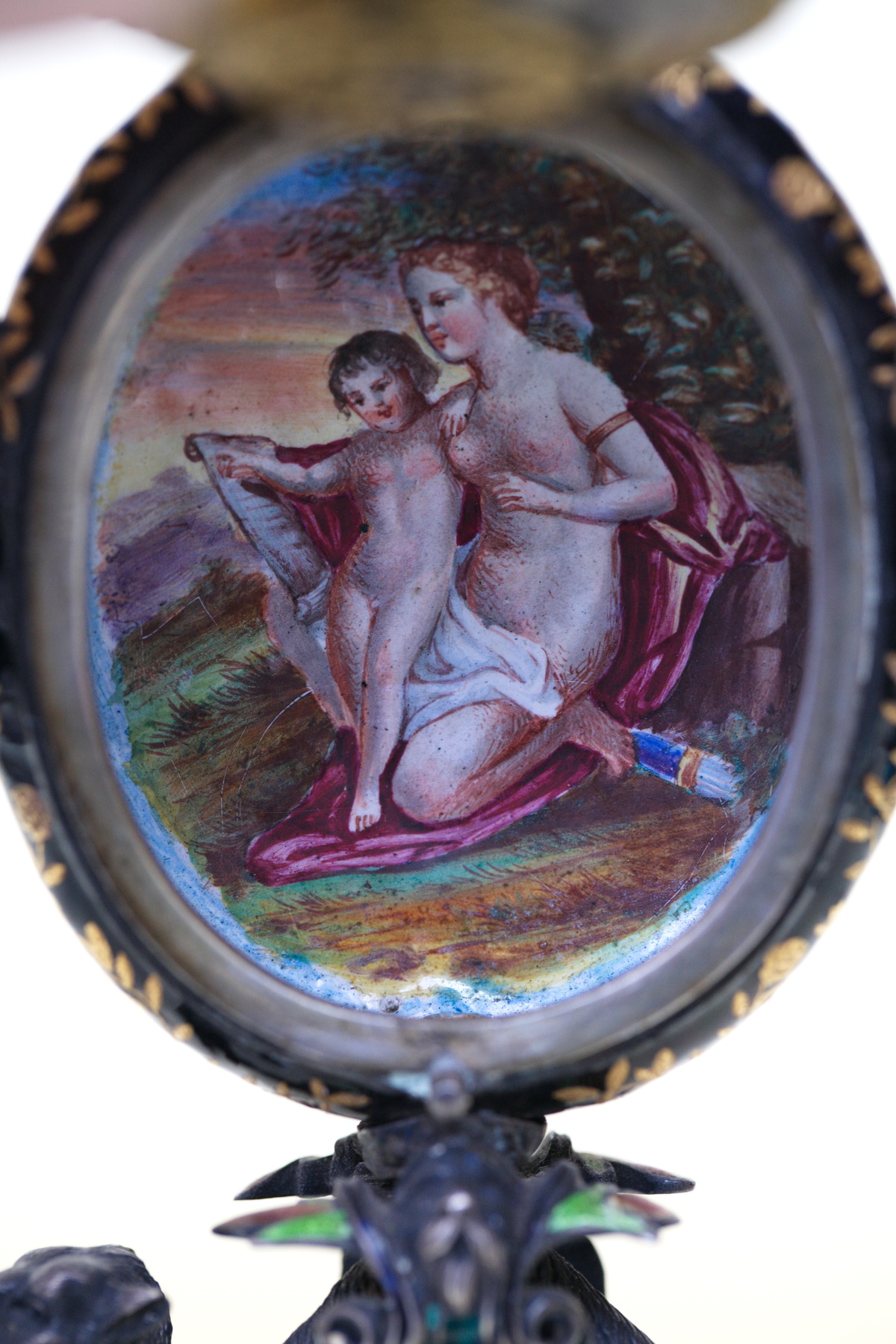 Clock in silver and enamels Vienna framing oval Suporte a dromedary movement Bertrand Paris time XIX