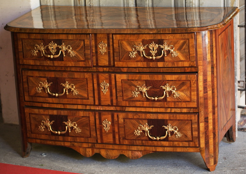 Commode Louis XIV veneer, olive and amaranth, rounded to three rows of two drawers in senior posts. Hinged handles and escutcheons bronze.Good condition