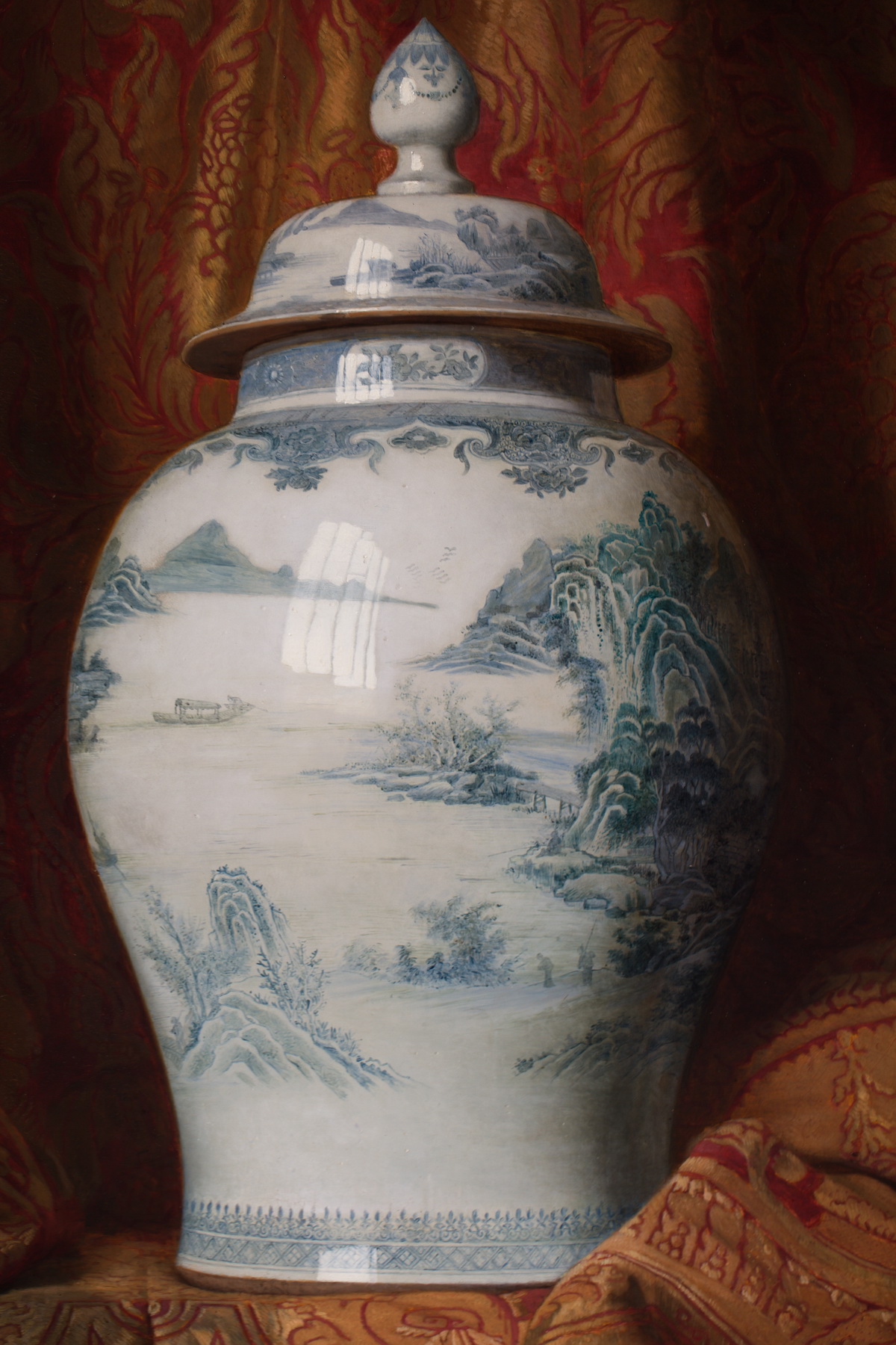 Oil on panel inlaid mahogany monogrammed and dated 1894 lower right "died in porcelain vase from China or Japan Nature."