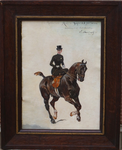 Ernest A.Bodoy XIX "Portrait of Mary of Segur d'Aguesseau amazon" oil on canvas signed autographed on the top right "memory of a collaboration on the back Paris May 8, 1883, waxed natural wood frame.