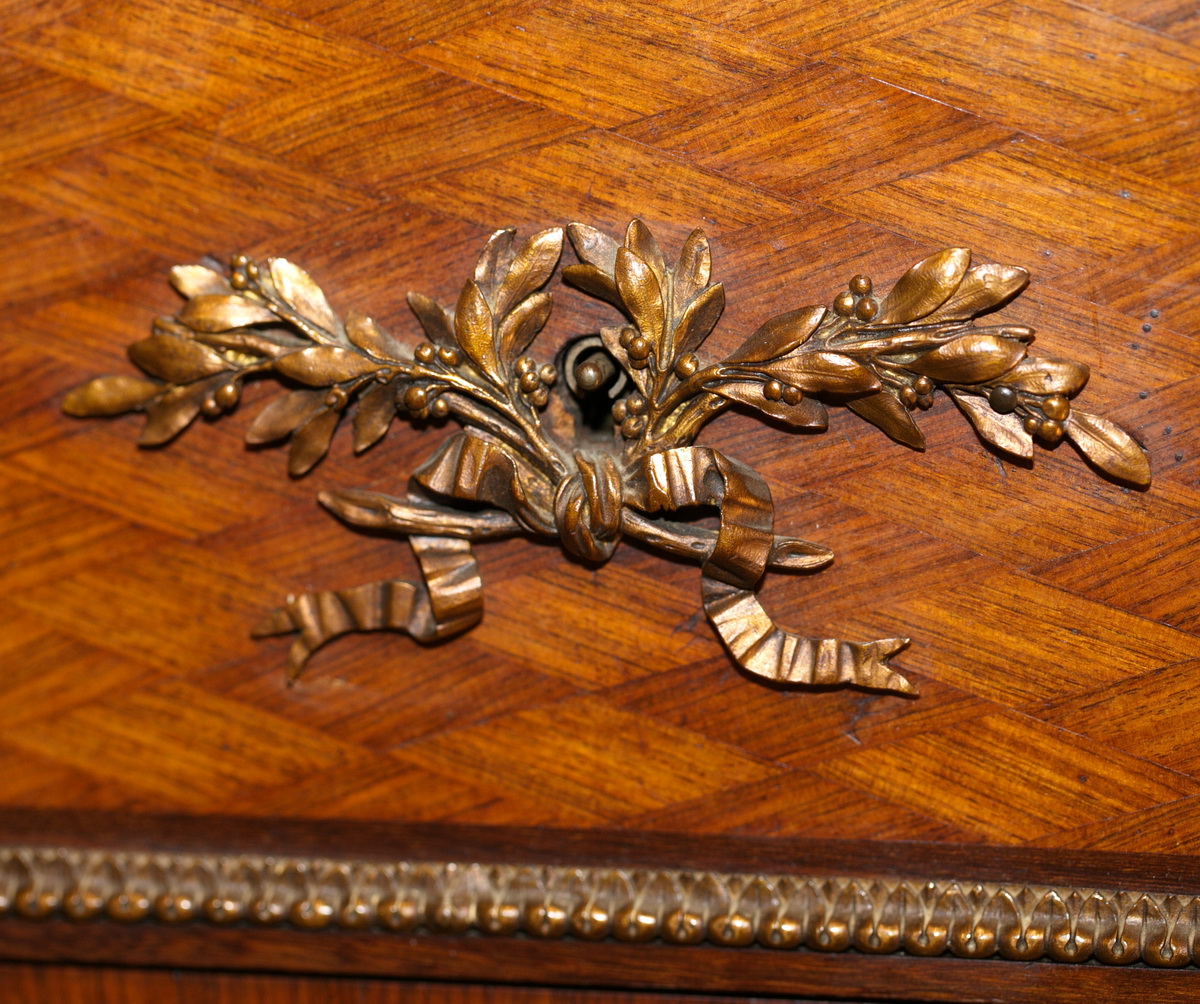 CABINET OF COLLECTOR. Stamped Grohe Paris veneer, ornate gilt bronze, red marble top birdseye circa 1847