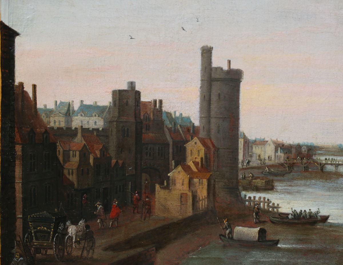 Hendrick MOMMERS 1623-1693 attributed to "The Hotel Nevers, tower of Nesle and large gallery of the Louvre since the new bridge" oil on canvas (some wear and restoration), lacquered and gilded frame (110x67)