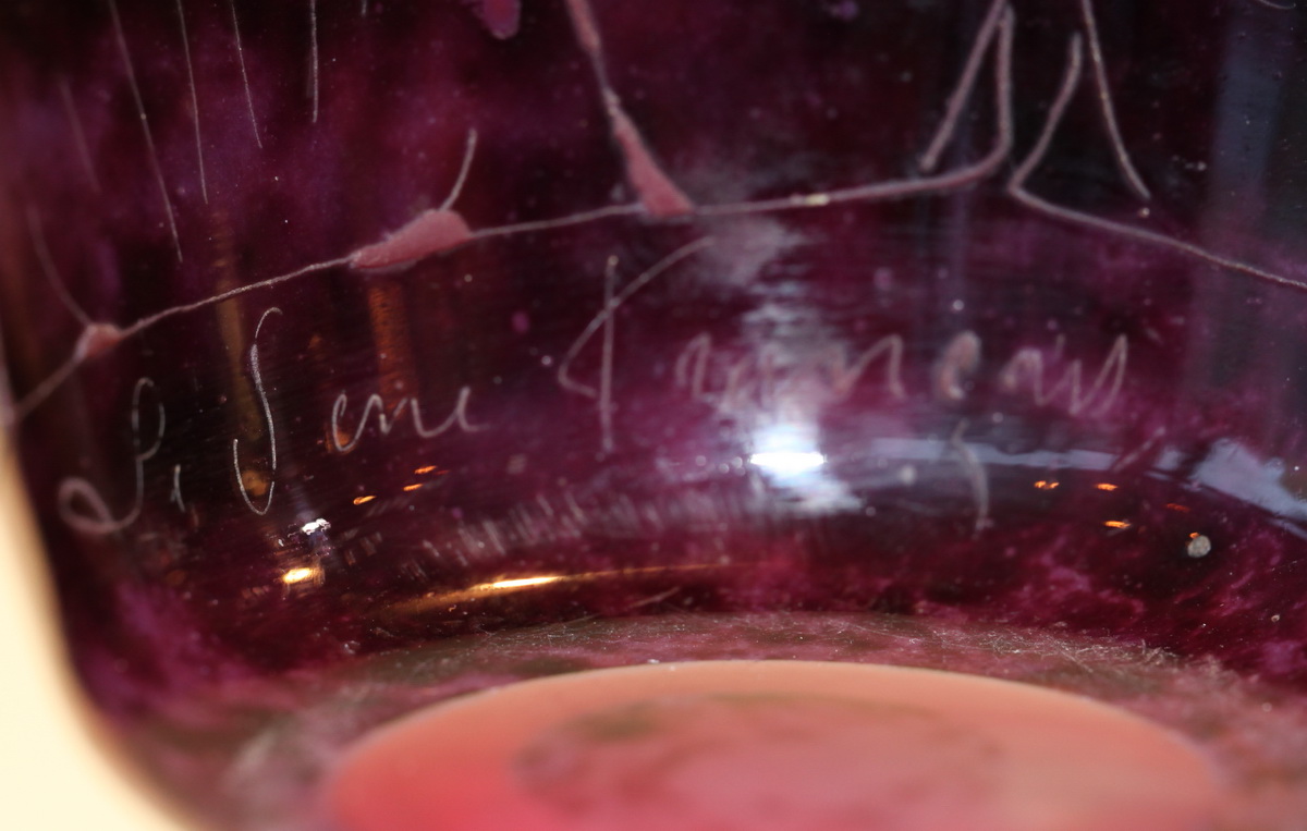 The multilayer glass vase signed Le Verre Français "Dahlias" circa 1923-1926 purple and violet glass decoration on pink and red background