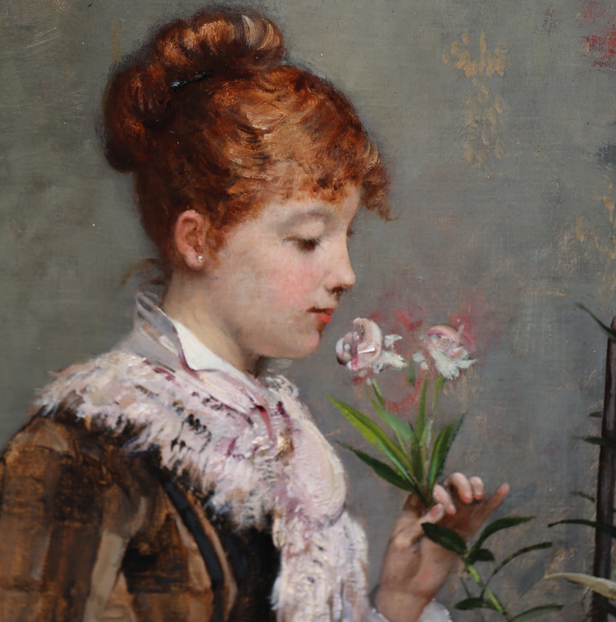 Louis Pierre VERWEE 1807-1877 "Portrait of young woman with lily" oil on canvas signed lower left, important framework gilded stucco (60x100)