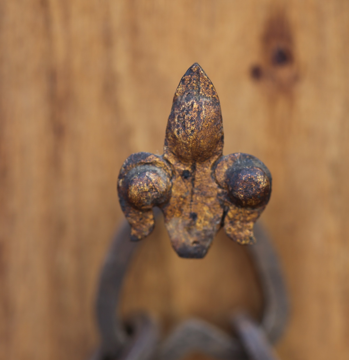 Series of 6 Louis XIII style wall lights, in patinated and gilded wrought iron and painted sheet metal with coats of arms, two sconces circa 1880