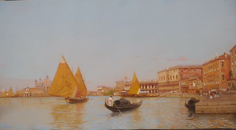 Millo Bartoluzzi XX "Grand Canal in Venice" gouache on paper signed lower left frame in carved and gilded wood.