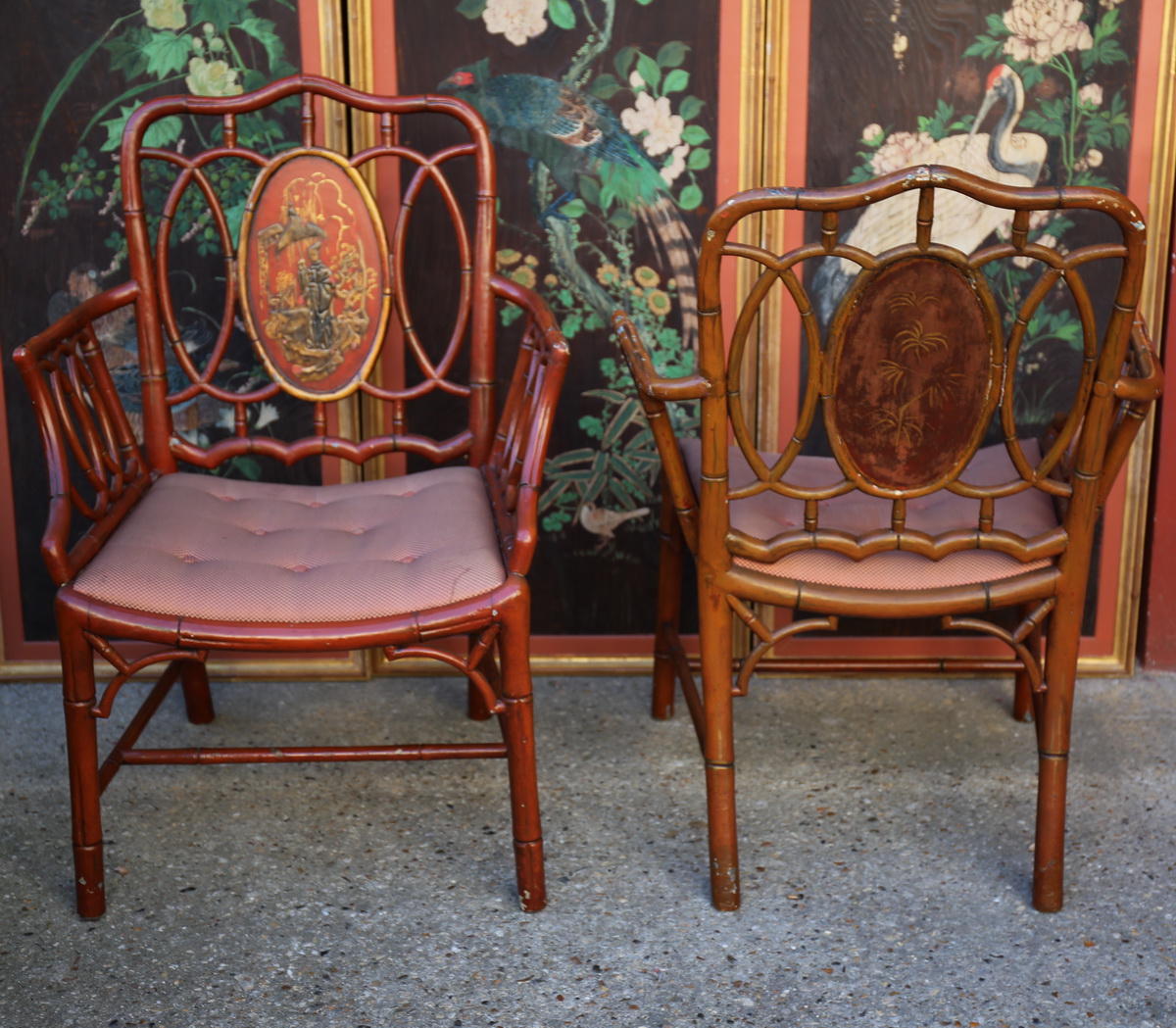 Pair of armchairs in the style of China, bamboo lacquered wood, lacquered medallion China red background late nineteenth time (seat 43cm)