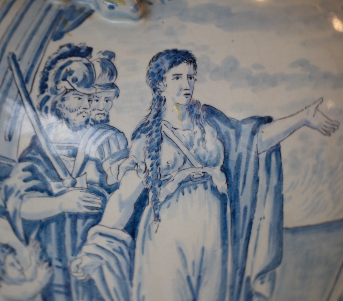 Savona Italy in the XVIII style, pair of tabletop fountains in blue faience, antique decor scenes, time XIX (égrenures and missing)