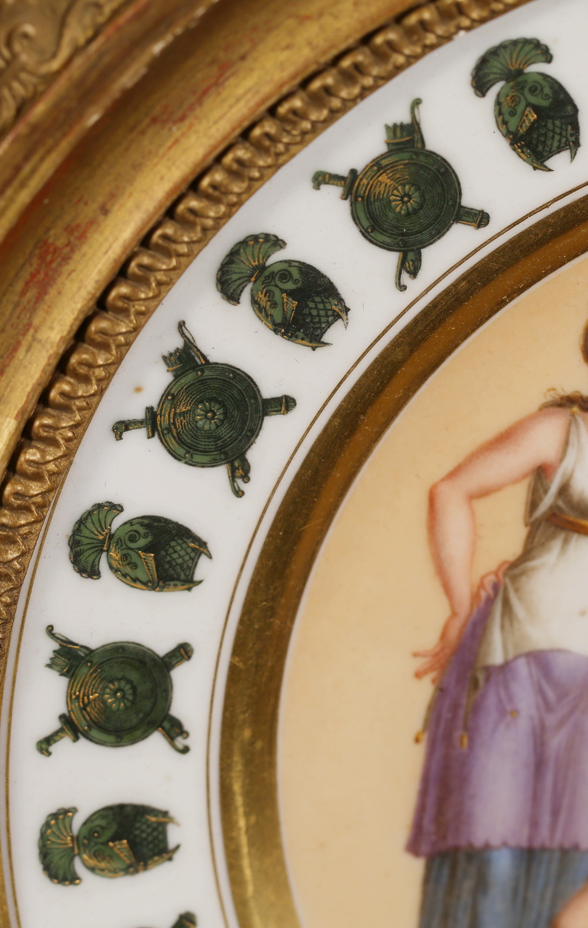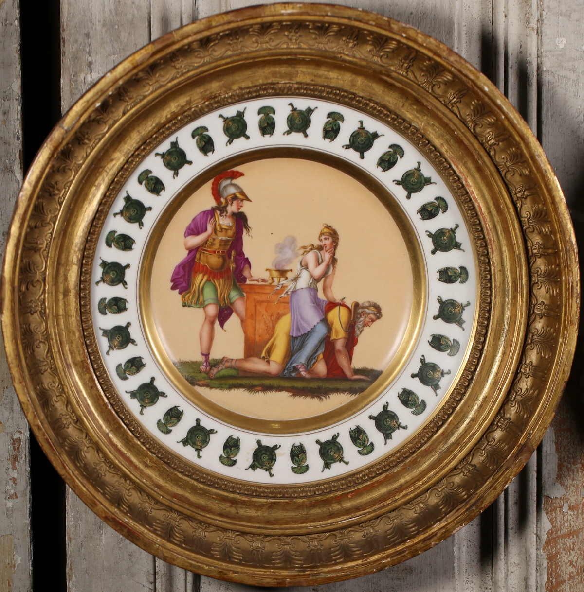 Paris around 1810, pair of plates decorated with antique characters on a nanking background, bronze helmets and weapons, tondo frames from the Empire 34.5