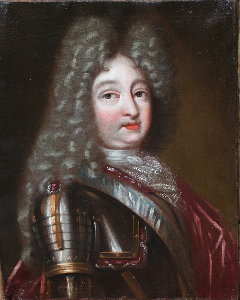 French School around 1700 by Pierre Gobert "Portrait of a man in armor" and time frame carved and gilded wood