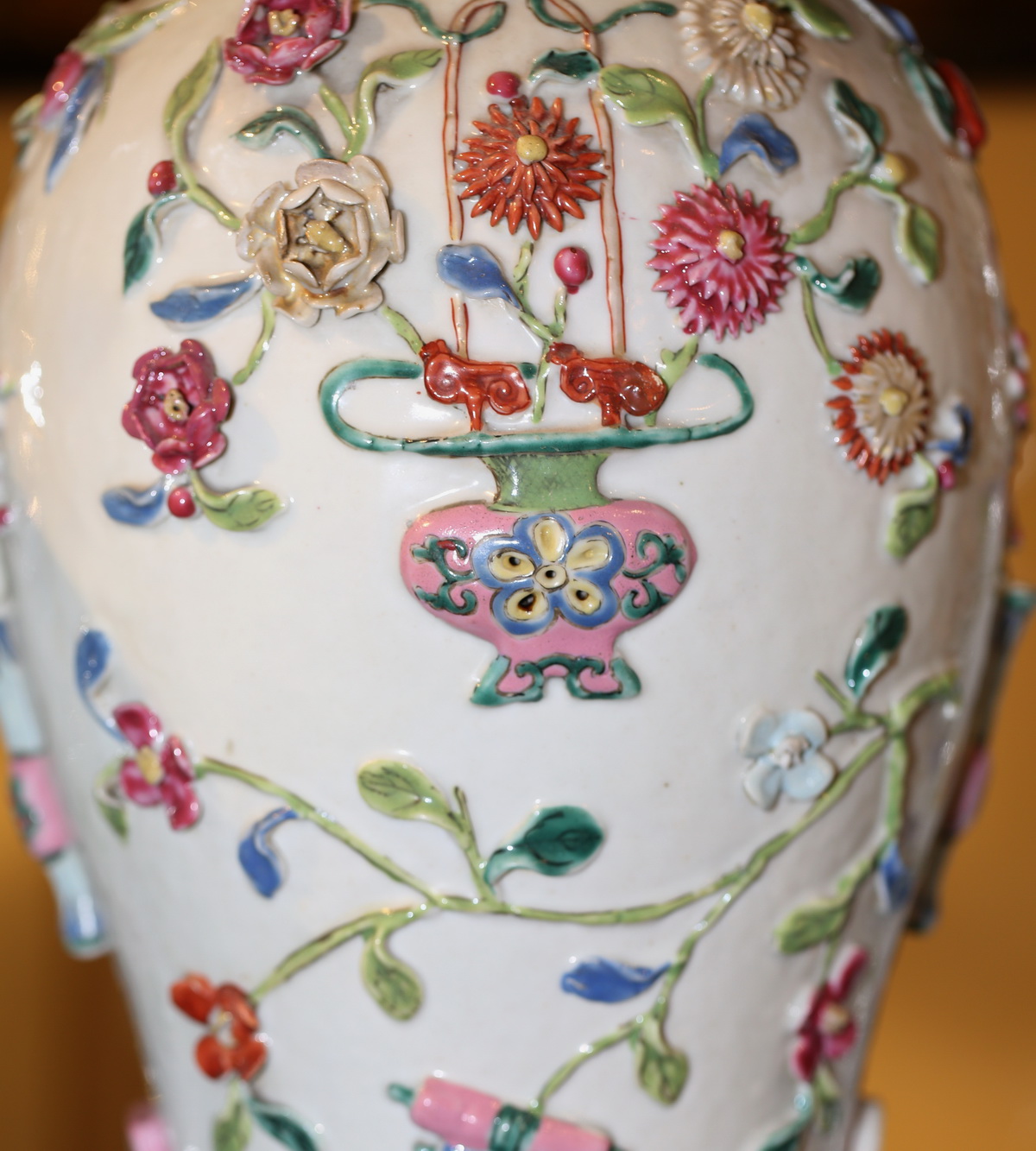 Famille Rose porcelain garnish, composed of 3 covered baluster pots and 2 cornet-shaped vases, 18th century China, Qing dynasty