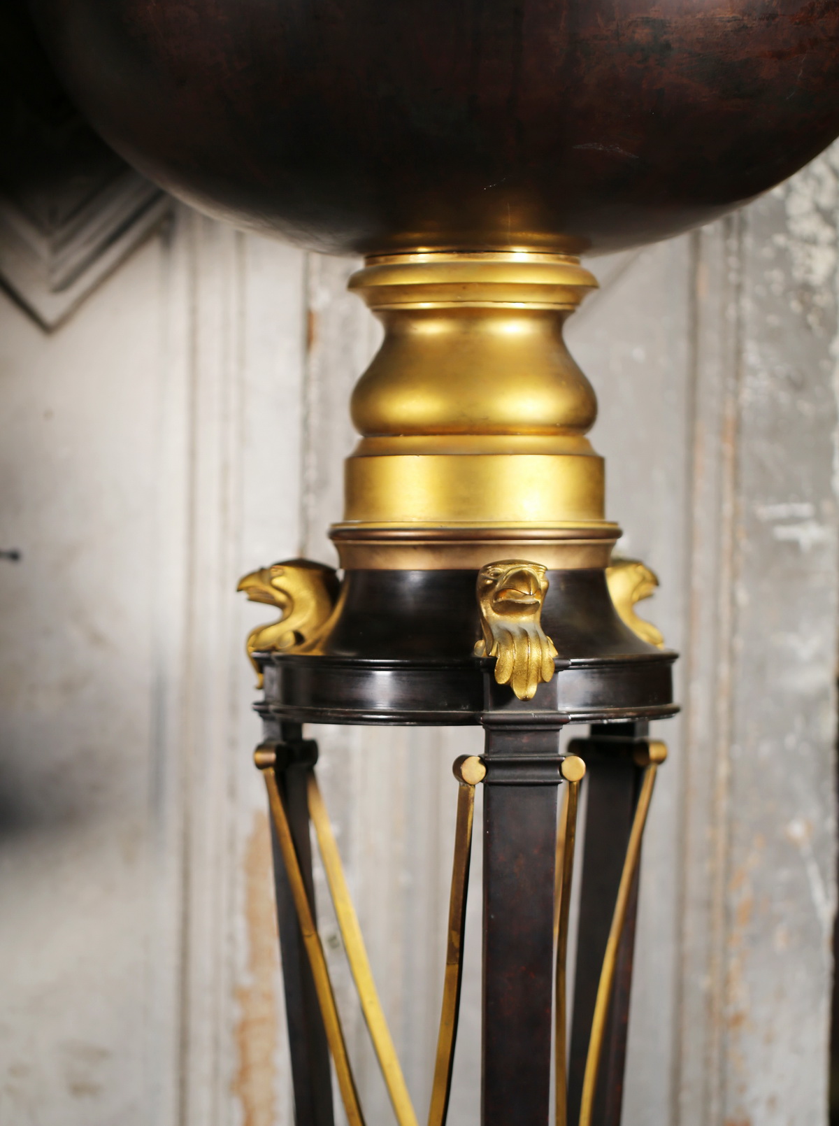 Suite of 4 important floor lamps in the shape of antique mid-twentieth-style braziers, wooden base painted false porphyry, Athenian gilded bronze and patinated with claw feet and eagle's head, patinated sheet metal cut.